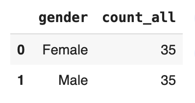 As a simple analysis we would like to know the number of rows for each gender in the dataset. We could run such query using panda’s read_sql function as in the following: