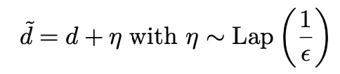 Note that, when 𝜀 becomes very large (low privacy), the formula reduces to the simpler formula above (without differential privacy). More interestingly, if 𝜀 becomes small (high privacy), the formula gives: