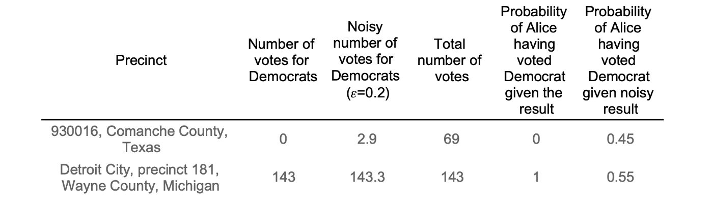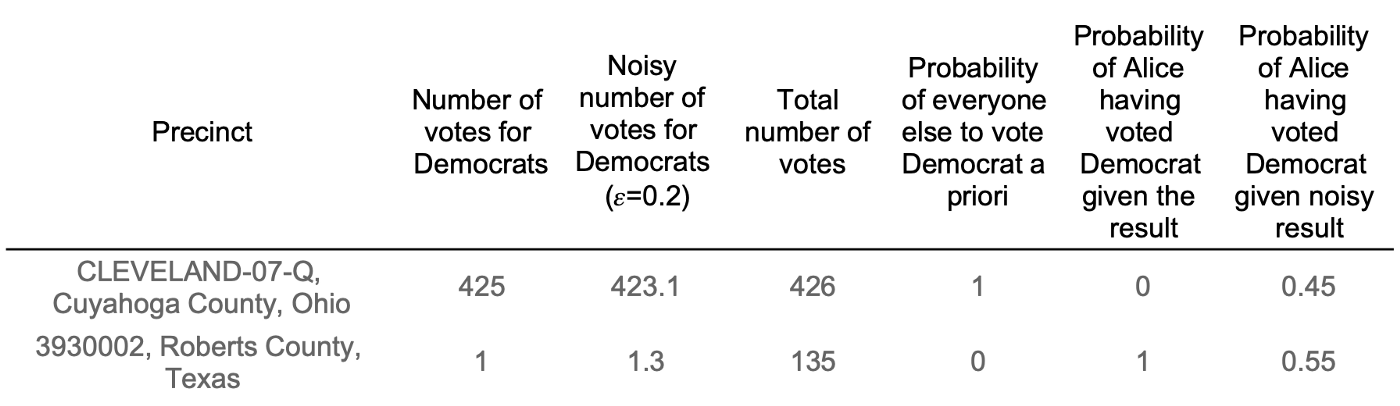 If we know that Alice lives in one of those precincts it is harder to deduce who she voted for. We need auxiliary information. If, for example, we know the probability that anyone-else in the precinct voted for a particular candidate, then we can be certain about Alice’s.