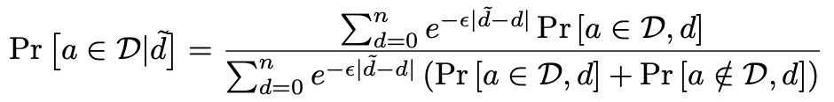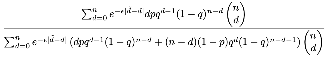 Because we added random noise to the exact count, d is imperfectly known, hence the exponentially weighted average over all possible d’s that makes deductions about one individual very imprecise.