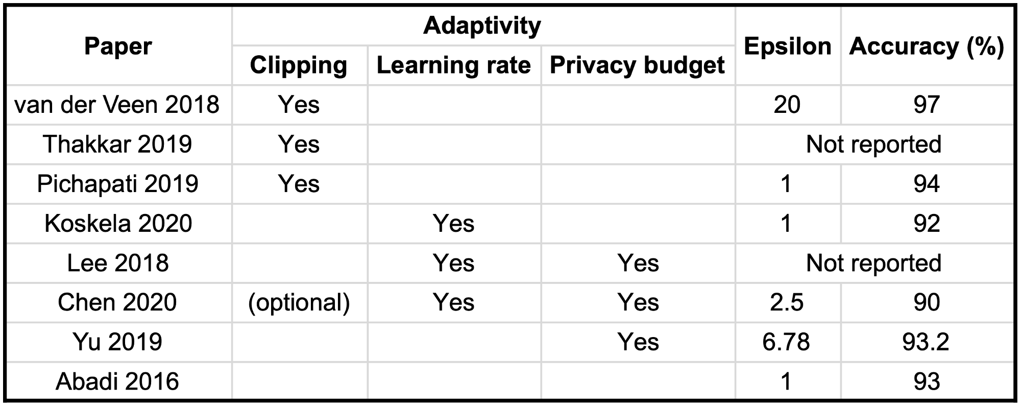 Finally, it should be noted that some versions of DP-SGD introducing adaptive privacy budget also integrate the clipping bound to their methodology as we will see later (see [Chen 2020] for instance).