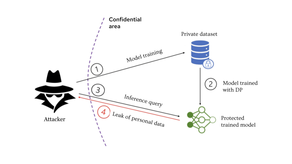 Our research consisted of designing an attack to assess the robustness of various DP parametrizations. The attack was built using a black-box model based on this research paper. The general idea is to train a machine learning model on a dataset and use the weights of this model to re-identify some data about a particular row in the training dataset. In our case, the attacker was allowed to add a custom column in the training dataset. Adding a custom column is something very usual in deep learning because data must be preprocessed and adapted to special training processes. But this ability also allowed the attacker to single out one household. All the attacker has to do is set the value of the new column to one just for this household, effectively creating an outlier. An outlier is a line that is very different from the others, which is more likely to have a bigger impact on the model weights. Therefore, using weights to extract some information about an outlier is easier. It makes it a good set-up to assess the privacy benefits of using DP during training. The logic of the attack can be described with the following schema.
