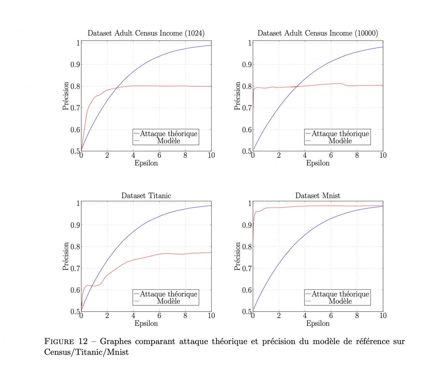 In our work, we tried to attack several datasets. First of all, to get theoretical results, we built a dummy dataset with only two columns containing bits (0 or 1). With this simple dataset, we were able to find precise theoretical results about the attacker’s maximum accuracy, which is defined as the attacker’s capacity to get the right bit of information he is searching. The closer the accuracy is to 1, the better the attack. Then, we used common machine learning datasets like Titanic, MNIST or Census which contain various types of information (personal information about gender, income, race, images…). On these datasets, we developed inference models, mainly Multi Layers Perceptrons and logistic regressions, and the models were trained using the Tensorflow package which implements the DP-SGD algorithm. Note that the models were trained to do usual machine learning jobs, in this case feature inference, and the attack did not prevent them from doing what they were built for. The following graph sums up the results on these datasets.