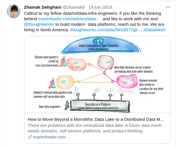 — distributed, domain-oriented data: as opposed to a centralized repository where many entities (think of Marketing, Operations, R&D…) push their data, a Data Mesh implies that Data is organized by domain. This means that data engineers have domain knowledge, and thus can be much more efficient and agile