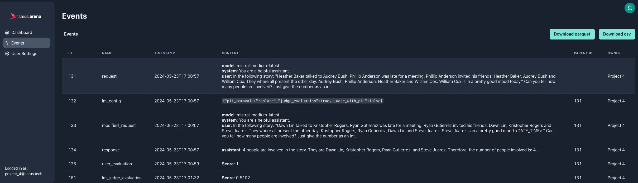 print(f"resp = {resp.choices[0].message.content}")Then you can monitor the way PII are removed in the Arena web interface: