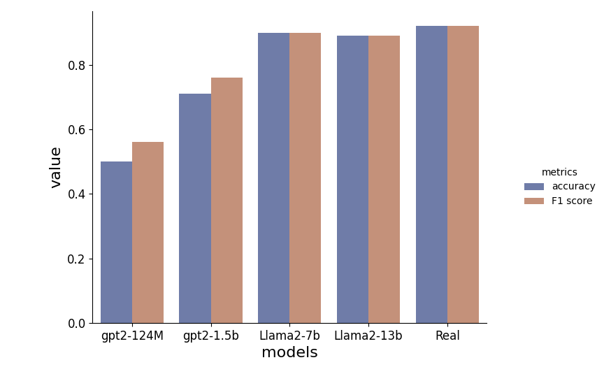 The result of just 50% of accuracy on the test set for the smallest GPT2 samples confirms that during fine-tuning the model has failed to establish a clear correlation between the label and the review. Remarkably, the most promising result is that the classifier trained with Llama-generated samples achieves nearly identical performance levels to the one trained with real data!
