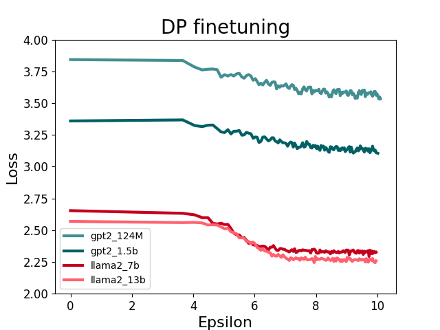 In the graph presented above, we show the training loss in relation to epsilon (for one LLM fine-tuning, we compute the budget spent at each gradient update, epsilon=0 corresponds to the first loss without any gradient update). Notably, larger models exhibit consistently lower loss values at the very beginning of training. This can be attributed to their inherent ability to generate higher-quality samples. Additionally, we observe a larger loss decrease across the training for larger models. This suggests that larger models possess the capacity to learn more from private datasets during training.