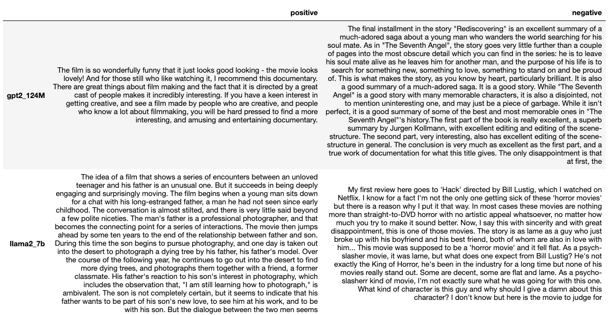 At the end of training, we sample 25,000 examples each, starting either with a negative or a positive label. A cursory examination of these samples reveals that smaller models have only marginally understood that the label pertains to a review. They struggle to establish a clear correlation between the input label and a positive/negative review. Furthermore, some examples diverge from movie references and venture into realms such as books or music. In contrast, samples generated by Llama-2 exhibit a greater degree of coherence and subtlety, with a more robust correlation between the input label and the review’s sentiment.
