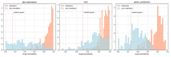 Using OpenAI’s ChatGPT 3 API for authenticity, we employed three text classification datasets (dair-ai/emotion, sst2 and poem_sentiment) to construct few-shots classification prompts from arbitrarily chosen samples. The OpenAI davinci model was then tasked with predicting the log probabilities for both member and non-member examples. Results were constrained to one token, and through logit bias, only projected possible class tokens.