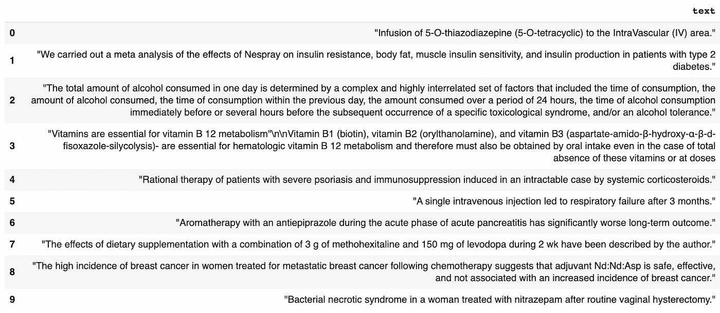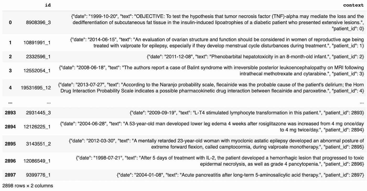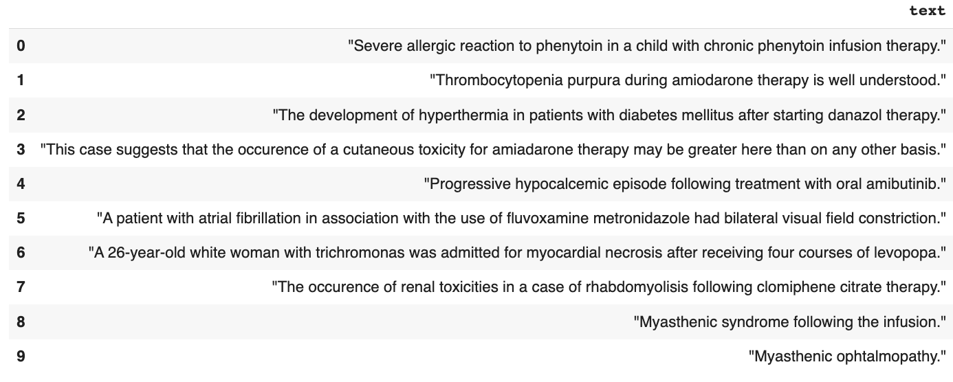 In this example, we use the PHEE dataset, a public patient dataset. This dataset was manually curated to make sure there was no identifying information. But in the general case, a medical dataset with a column of free text is highly risky.