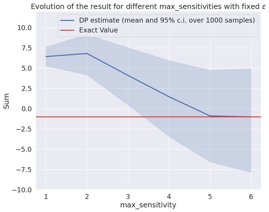 As we can see, when max_sensitivity is too high, the noise added makes the result unusable, but a value too low gives a result way too biased. Depending on what we want our analysis to achieve, we can set the right value to obtain the expected tradeoff.
