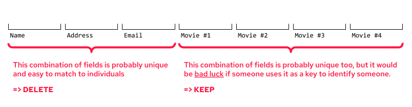 To anonymize a dataset, intuition tells you to remove what may be used to identify someone. You have to provide an answer to the question “what are the odds that one would use parts of the data to identify someone?”.