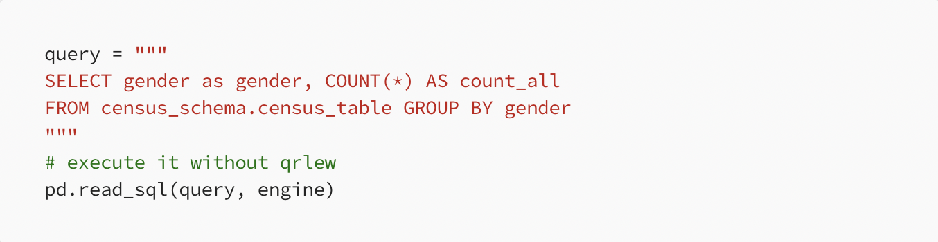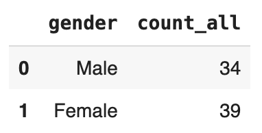 As a simple analysis we would like to know the number of rows for each gender in the dataset. We could run such query using panda’s read_sql function as in the following: