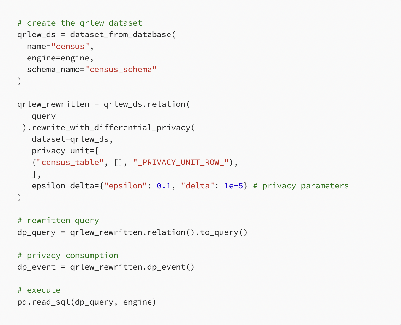 Notice that to rewrite the query we need some inputs such as the privacy_unit which defines what we want to protect (each row in this case) and a privacy budget epsilon_delta, a parameter to control for the amount of protection we want to provide. As we can see from the results, they contain some noise which is proportional to the privacy budget used. The privacy consumption for our analysis, dp_event, is compatible with Google’s dp accounting library, a popular library for tracking differential privacy budgets.