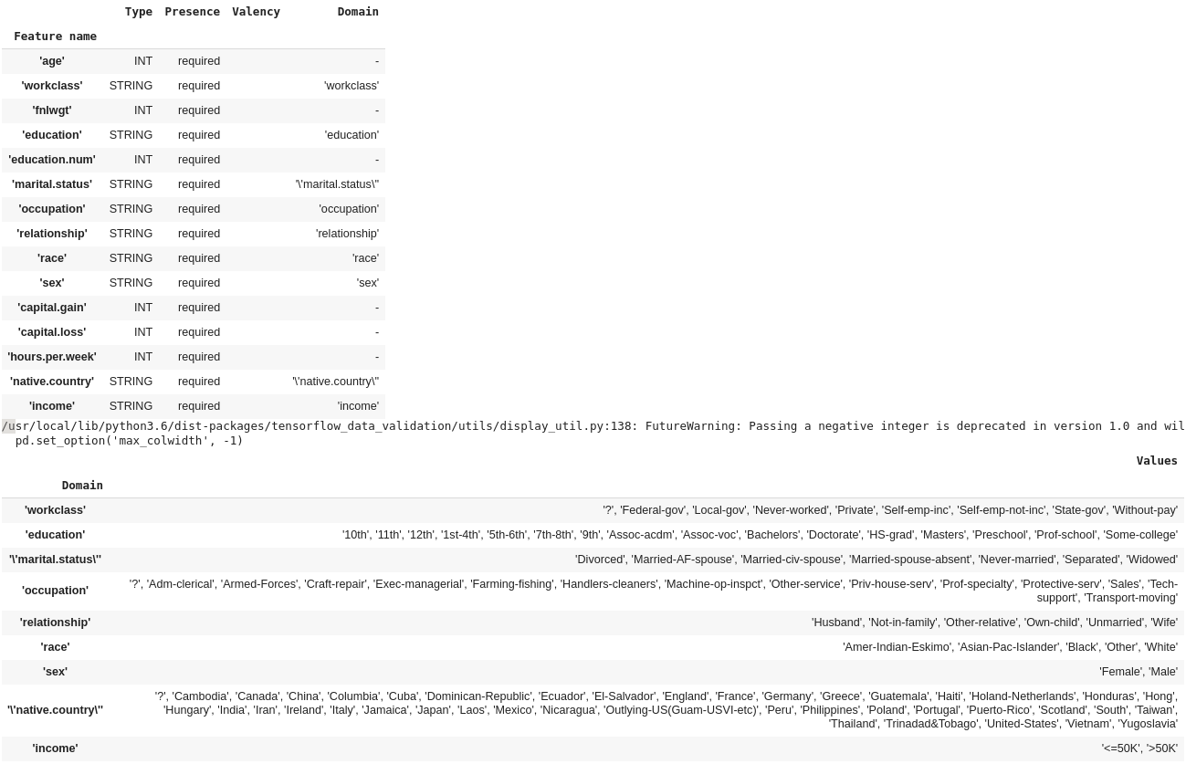 Unfortunately these statistics are not differentially private and may leak sensitive information (think about a case where only one individual is in a category). Therefore, at Sarus, we could not use these statistics directly (we built a custom component to generate differentially private stats, which is basically our own StatisticsGen component). But we can still use the TFX statistics for schema inference .