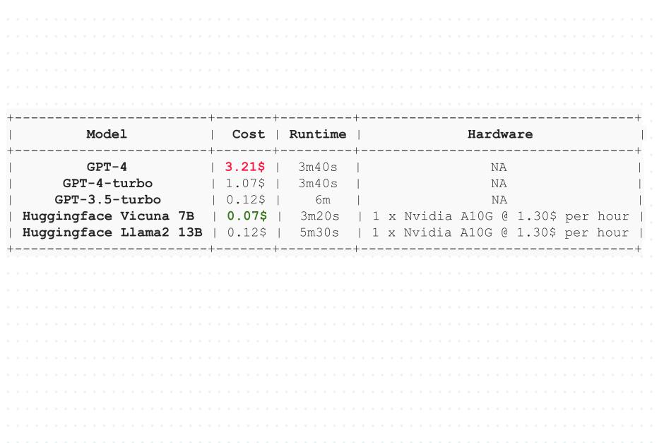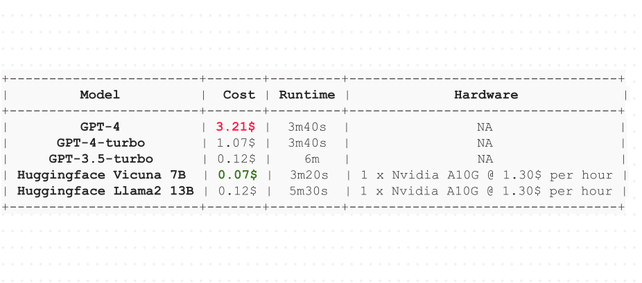 - Open-source models: As proxies for self-hosted models, we examine Vicuna-7B and Llama2–13B, deployed on Huggingface’s inference endpoints, including their cost, runtime, and associated hardware rental costs.