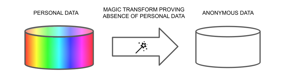 Luckily, some transforms can guarantee that whatever the input, there won’t be personal data in the output. For more on it, you to check out Differential Privacy literature (a good intro). For now we just need to know that such transforms do exist. We represent them with a magic wand. We can then extend our logic with the following rule: