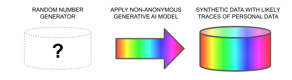 Synthetic data is typically generated from an AI model trained on personal data. It can be rainbow-colored or not depending on how the training is done. The final process of generating data from this model requires inputting random values (clearly not personal) and feeding them into the model to output synthetic records.